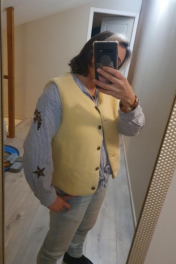 “Gilet doux avec l'intérieur en peau. Ce jaune doux rajoute de peps à un chemisier, très sympa !”
