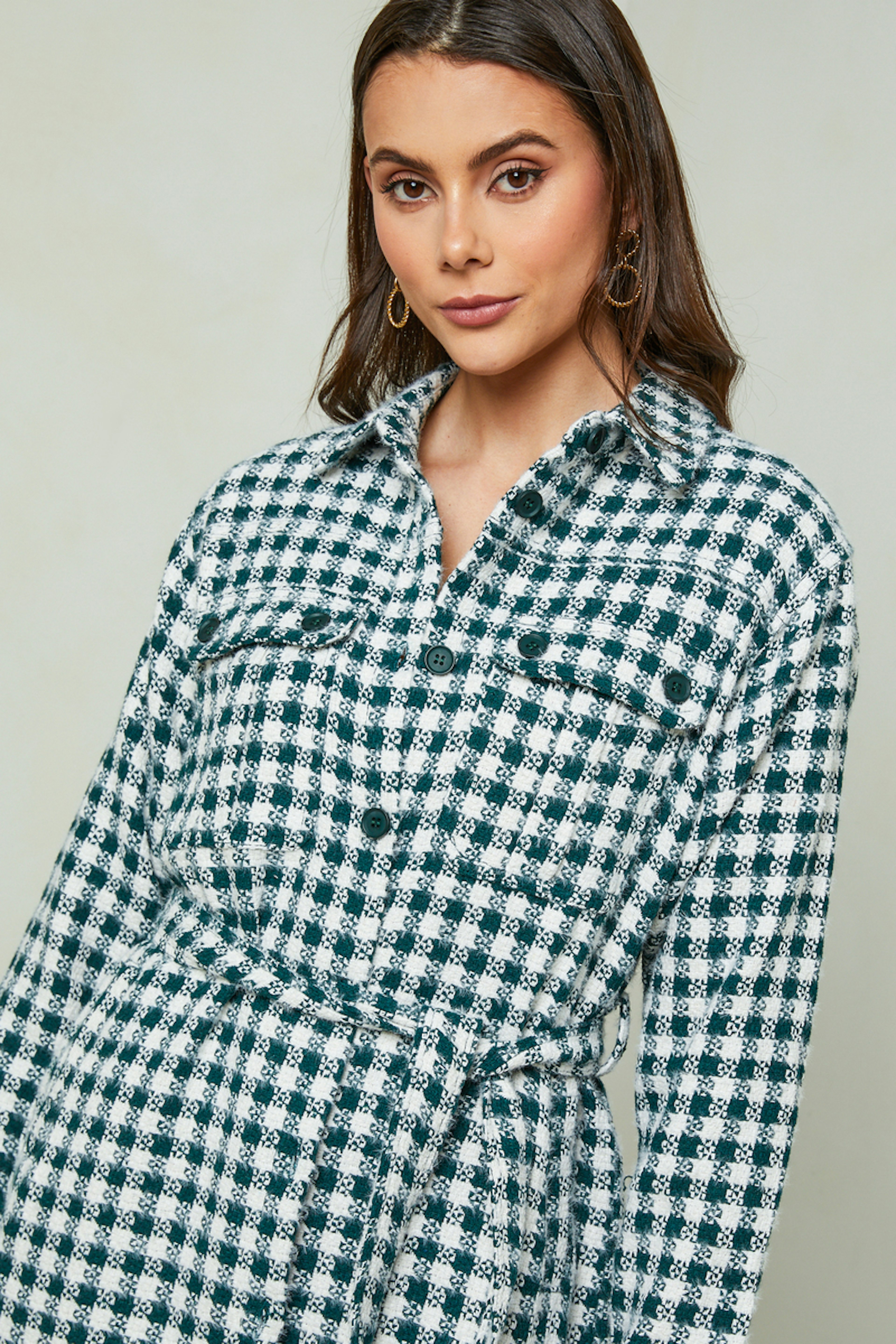 - Veste chemise ร motif carreaux - Col chemise - 2 poches poitrine - Fermeture boutonnรฉe sur le devant - Ceinture ร nouer ร la taille - Manches longues Le mannequin mesure 178cm porte la taille S