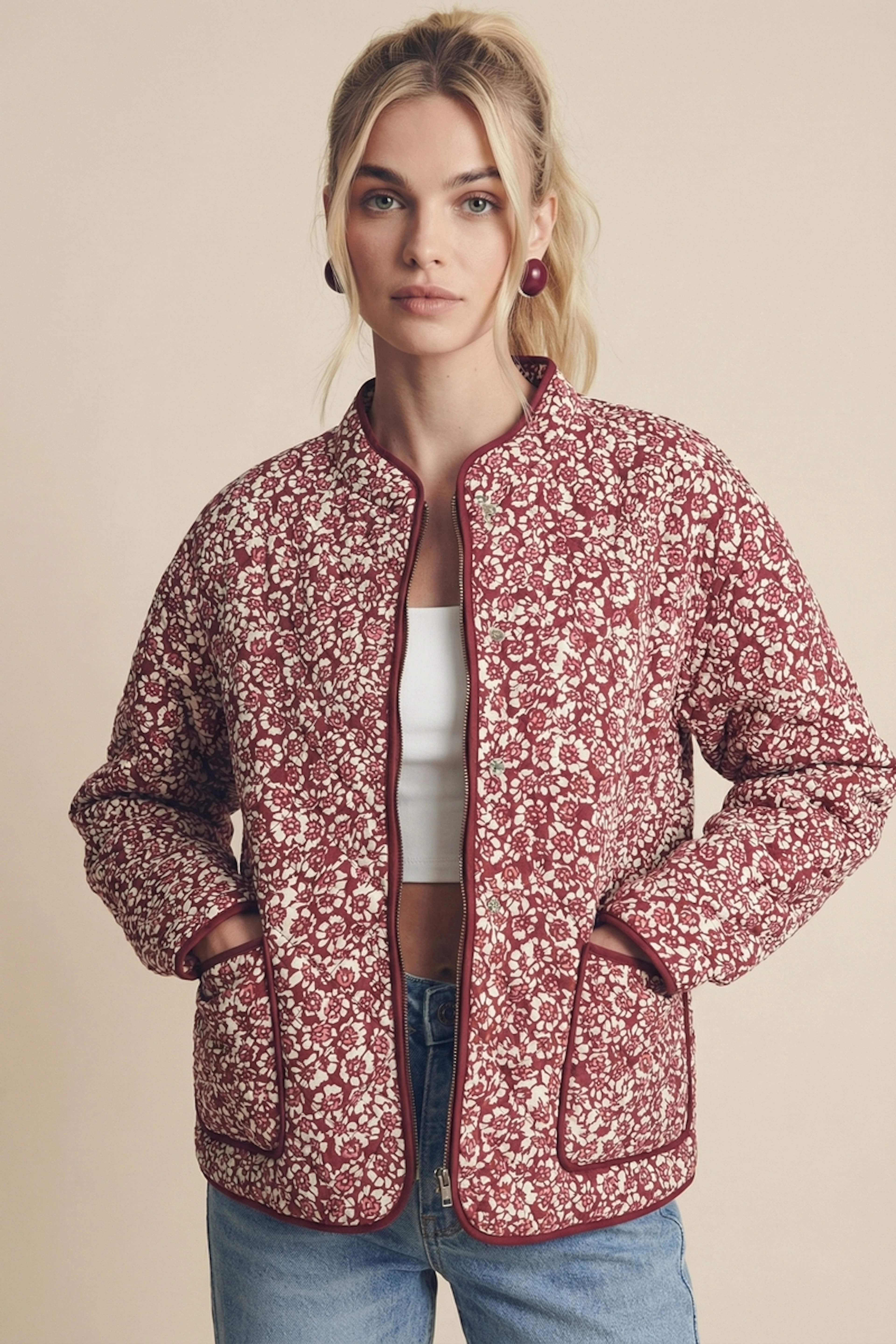 Associez cette veste florale à un jean taille haute pour un look estival dynamique. Ajoutez des accessoires simples pour sublimer le motif. • Veste à motif floral • Coupe droite • Manches longues • Fermeture boutonnée • Doublure contrastante
