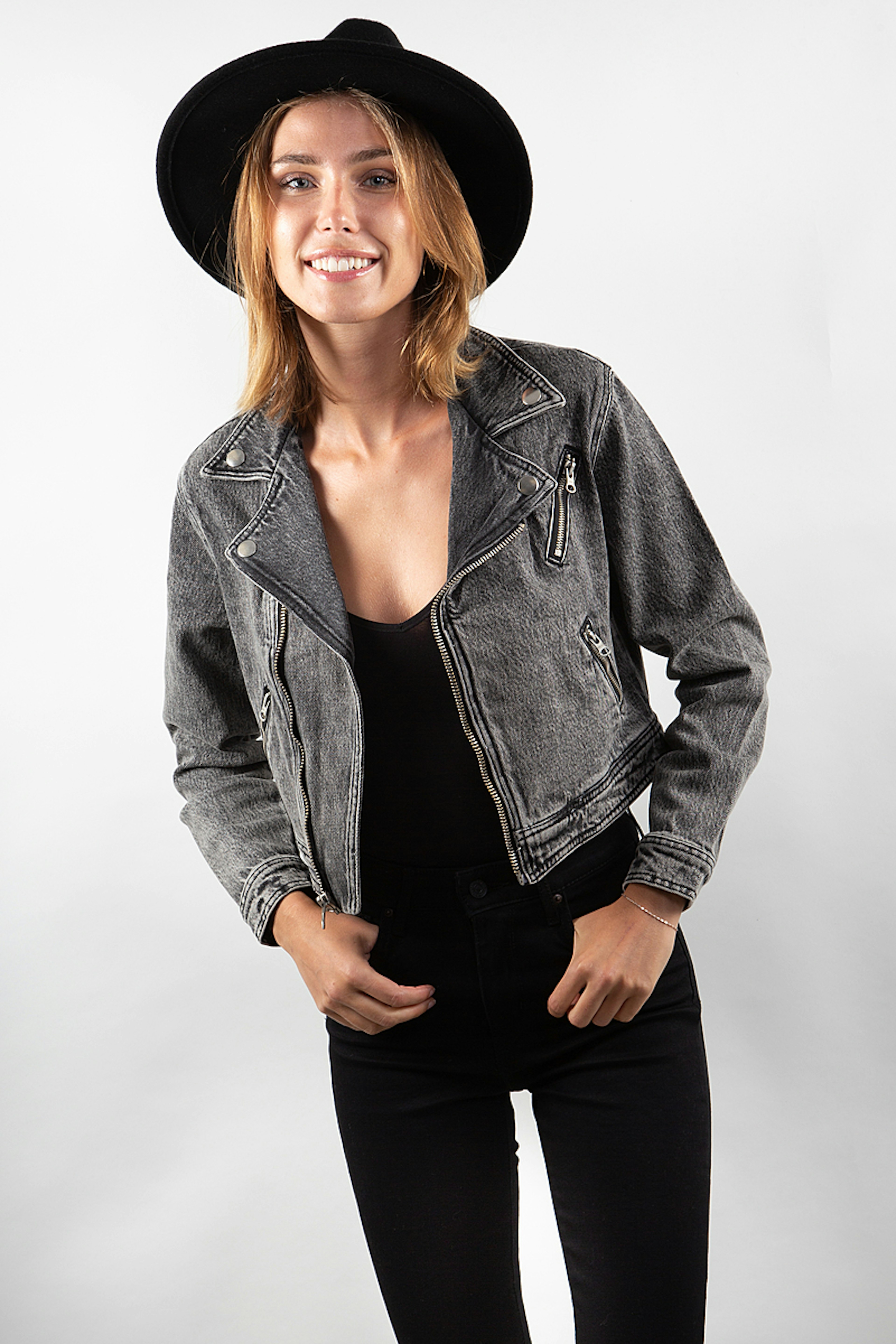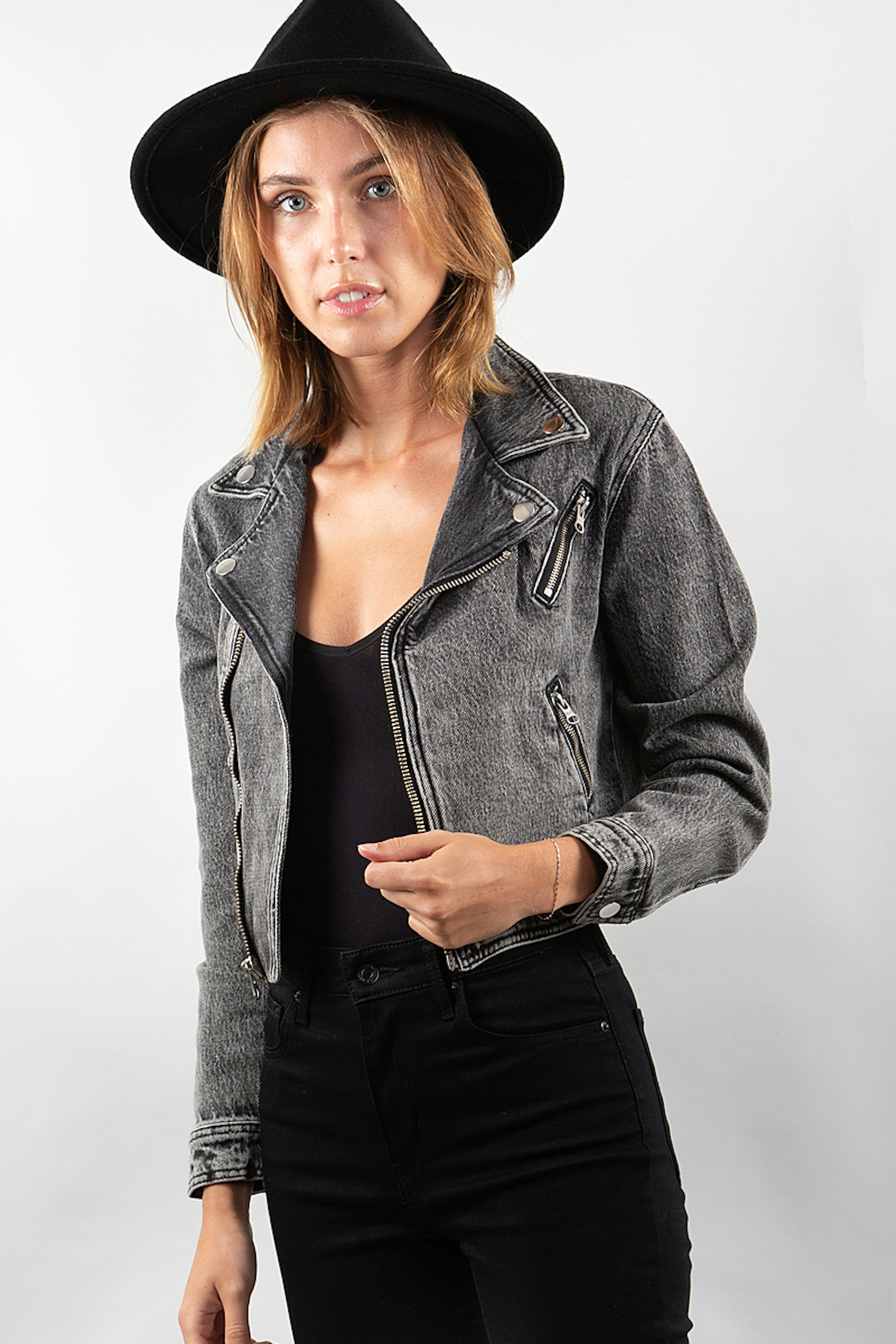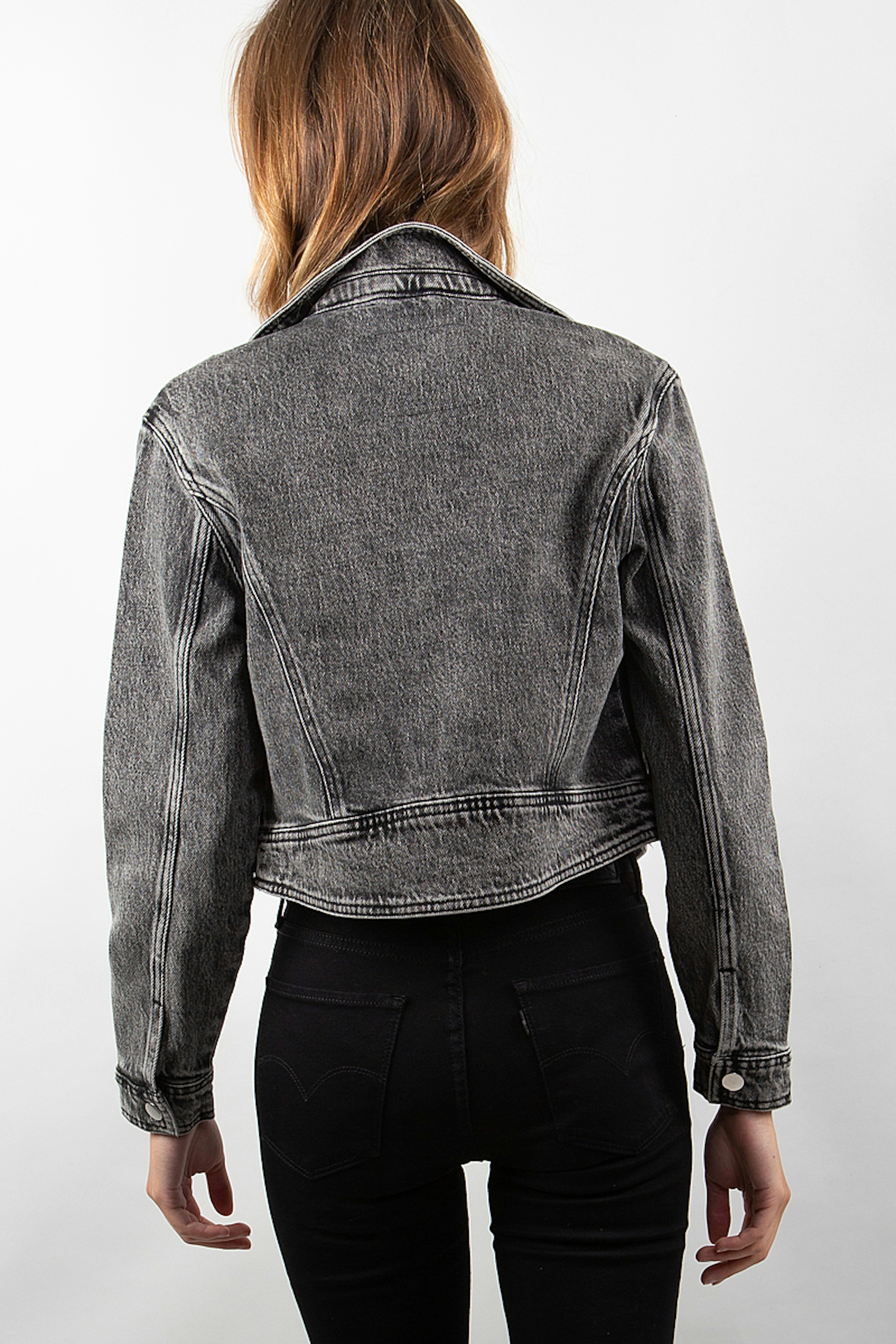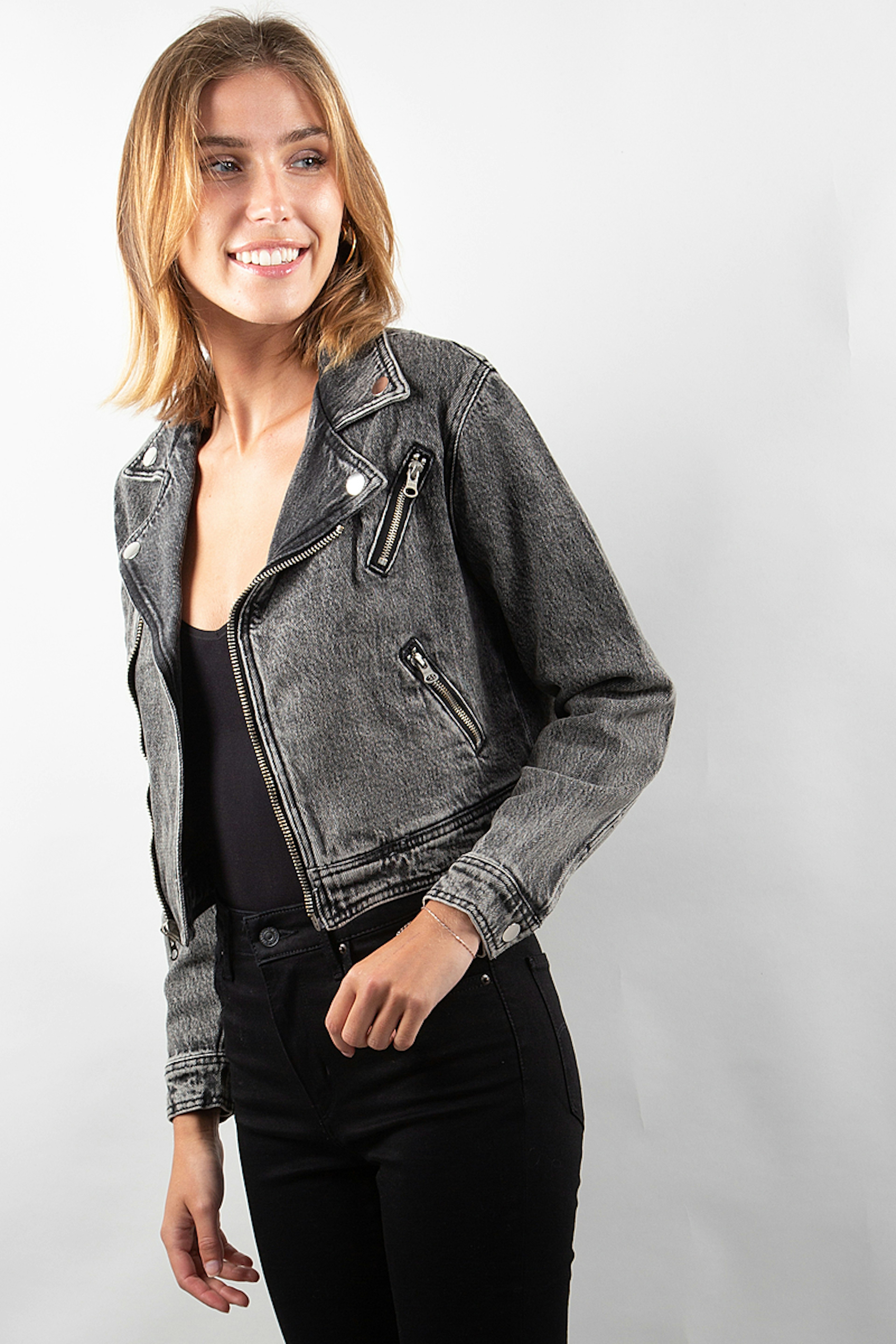 Gros coup de coeur pour cette veste en jean au look rock. โข Veste en jean raccourcie en jean dรฉlavรฉ noir au style motard โข Fermeture รฉclair asymรฉtrique sur le devant โข Manches longues avec fermeture ร bouton โข Boutons-poussoirs sur le col