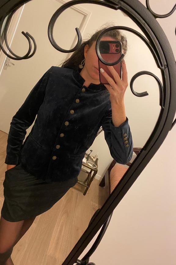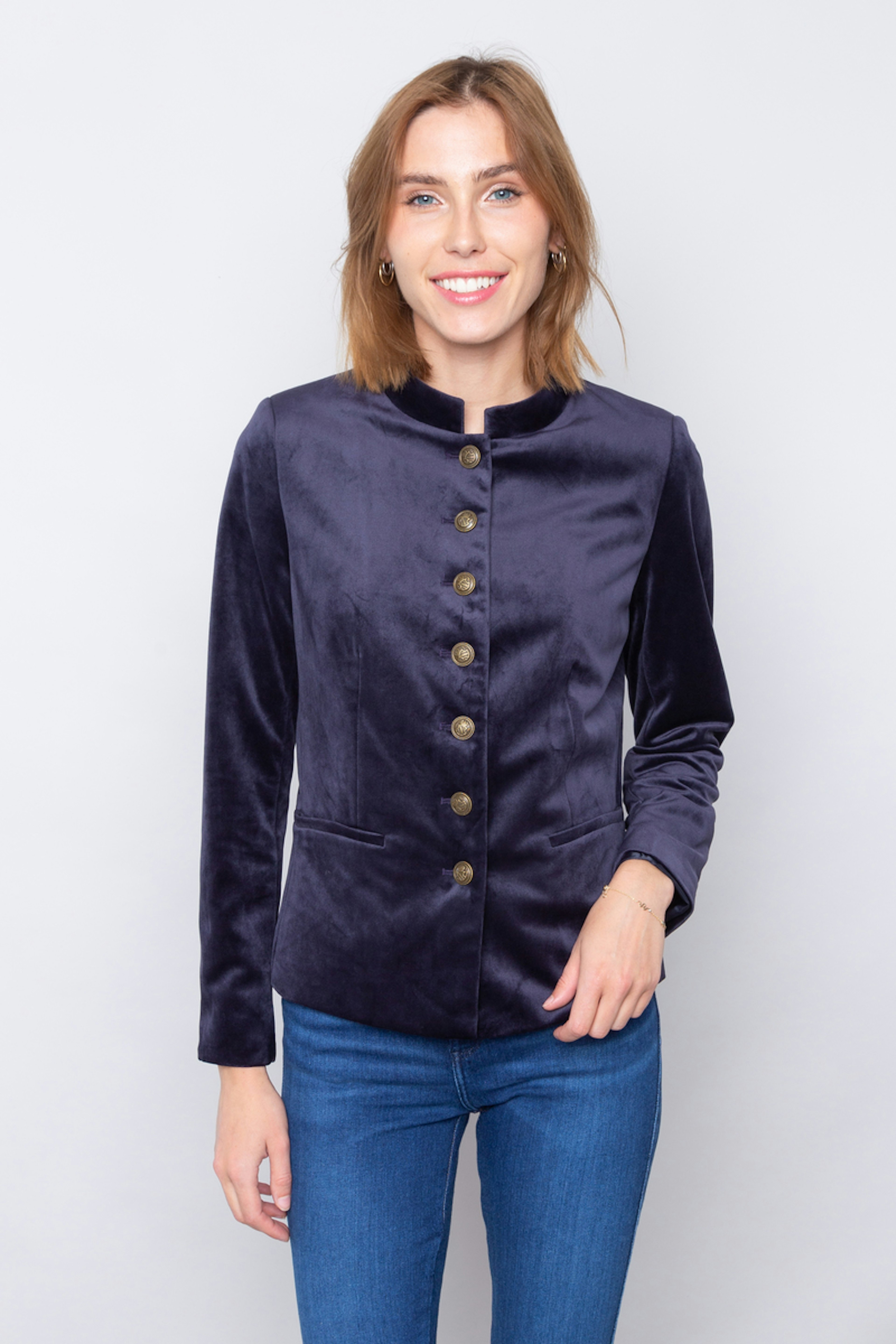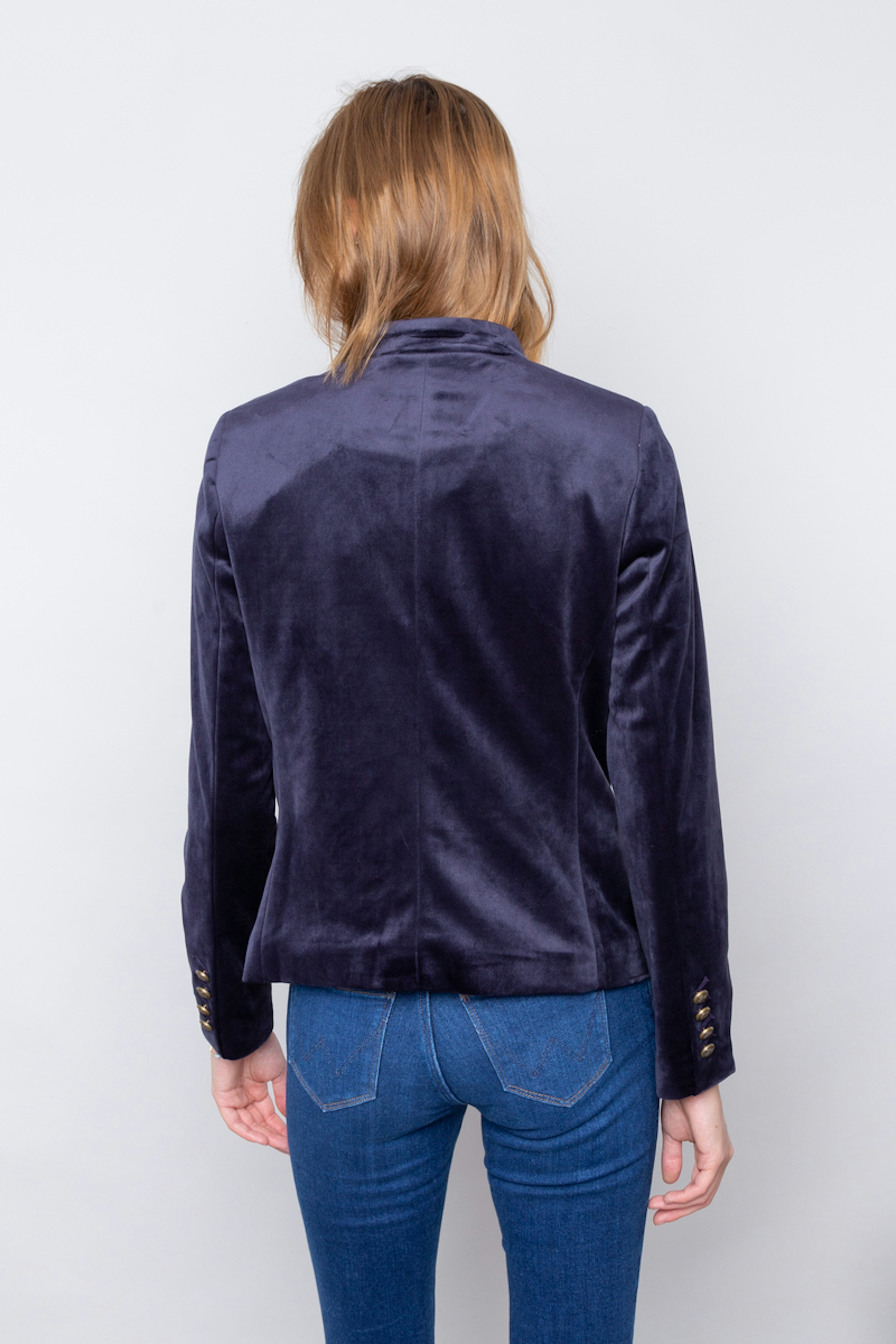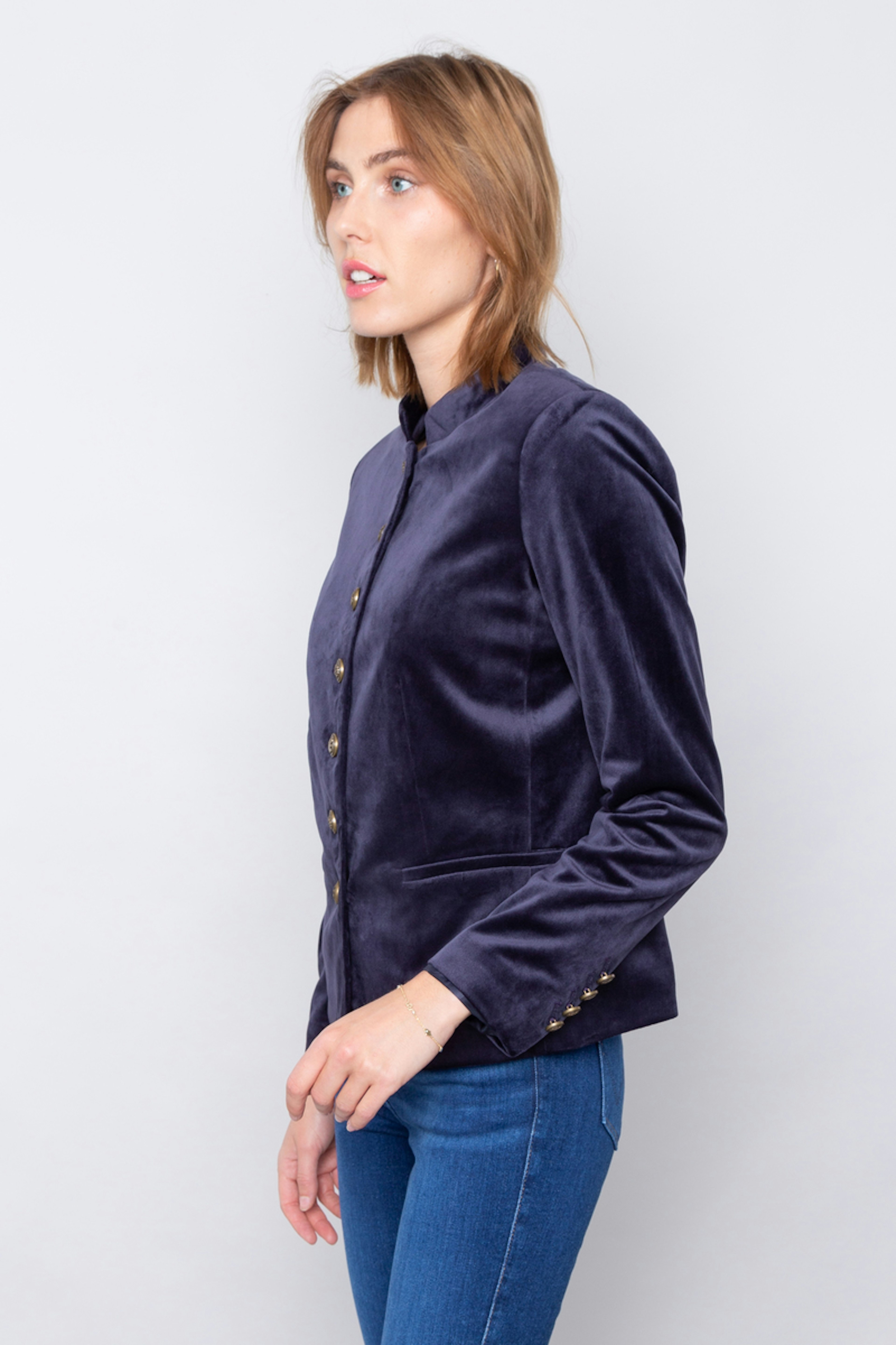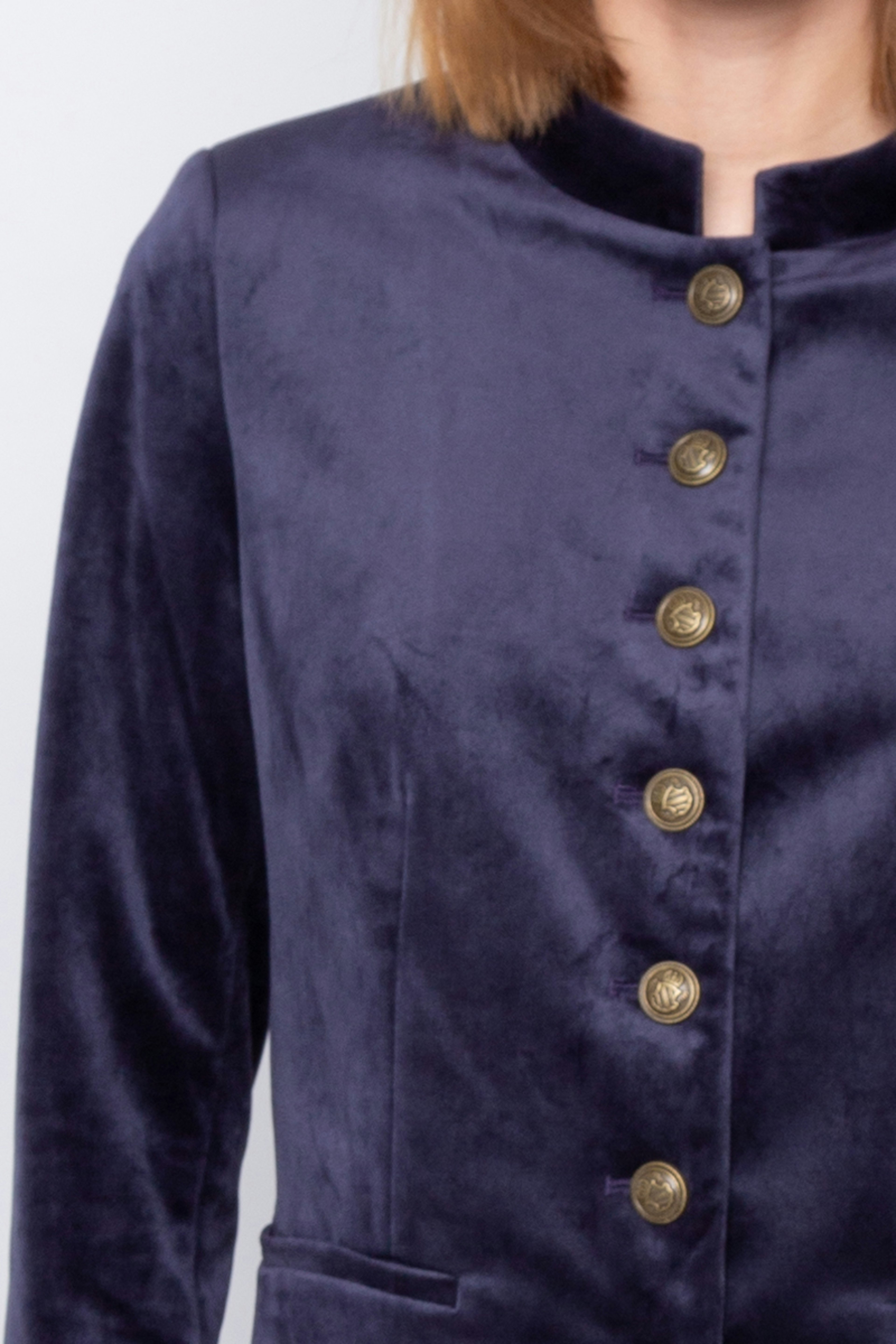 โข Veste en velours bleu lisse โข Col montant โข Fermeture avec boutons martelรฉs โข Poches latรฉrales
