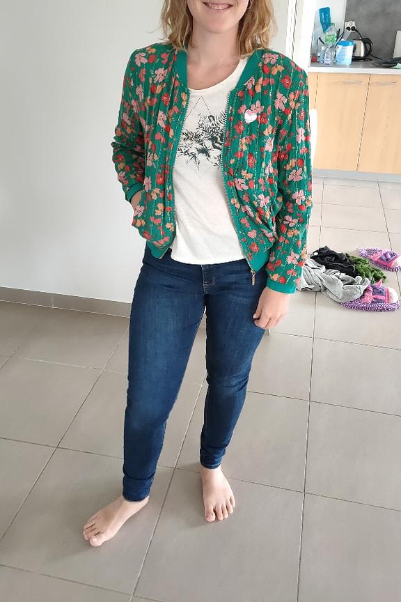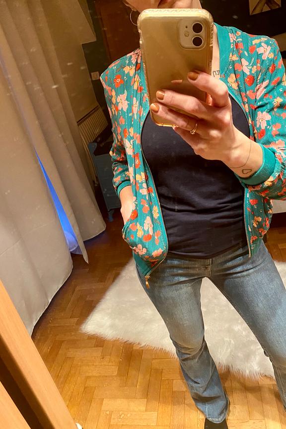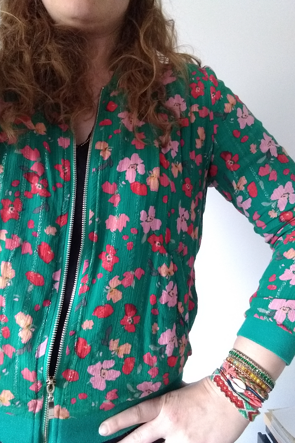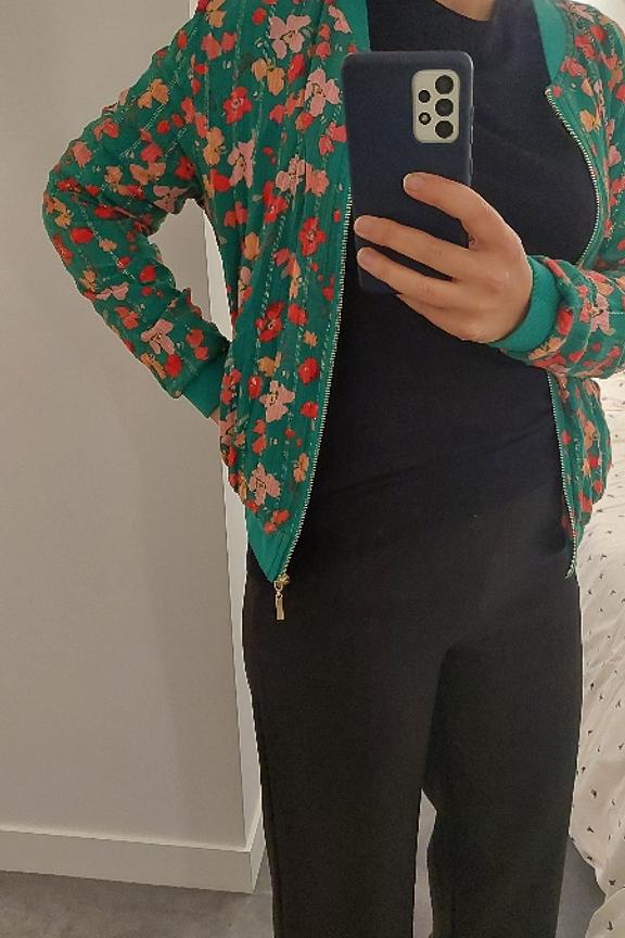 โข Veste bomber ร manches longues verte โข Imprimรฉ fleuri avec dรฉtails de lurex โข Idรฉal pour l'รฉtรฉ sur un top colorรฉ