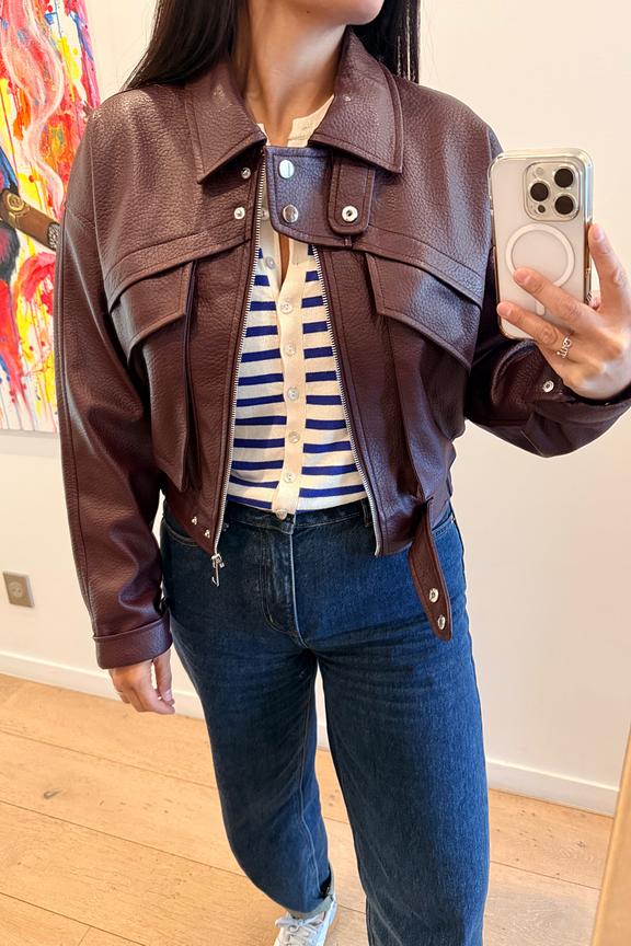Associez cette veste marron à un pantalon taille haute et des bottines pour un look chic hivernal. • Veste courte • Fermeture éclair centrale • Col chemise • Manches longues • Ceinture avec boutons-pression