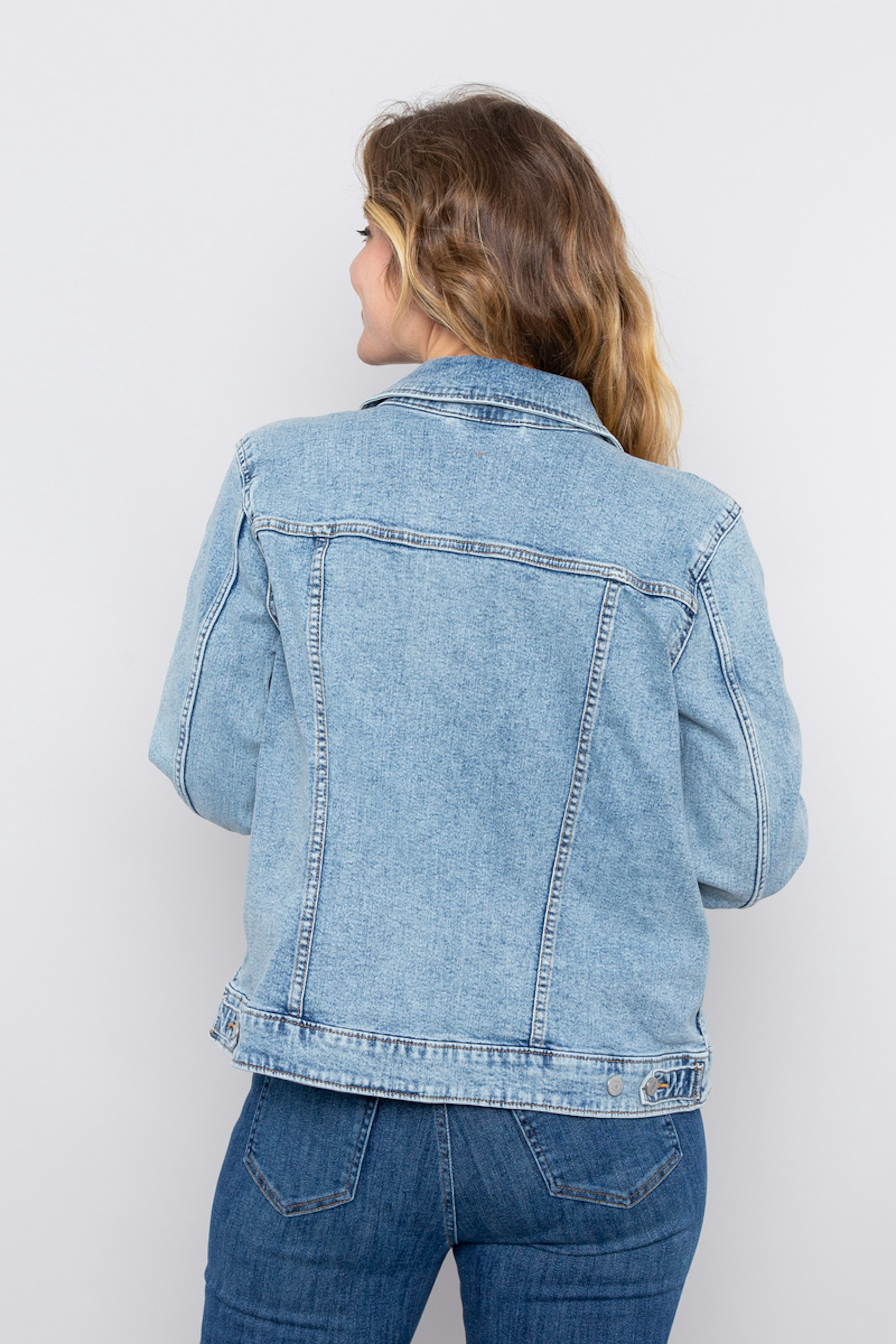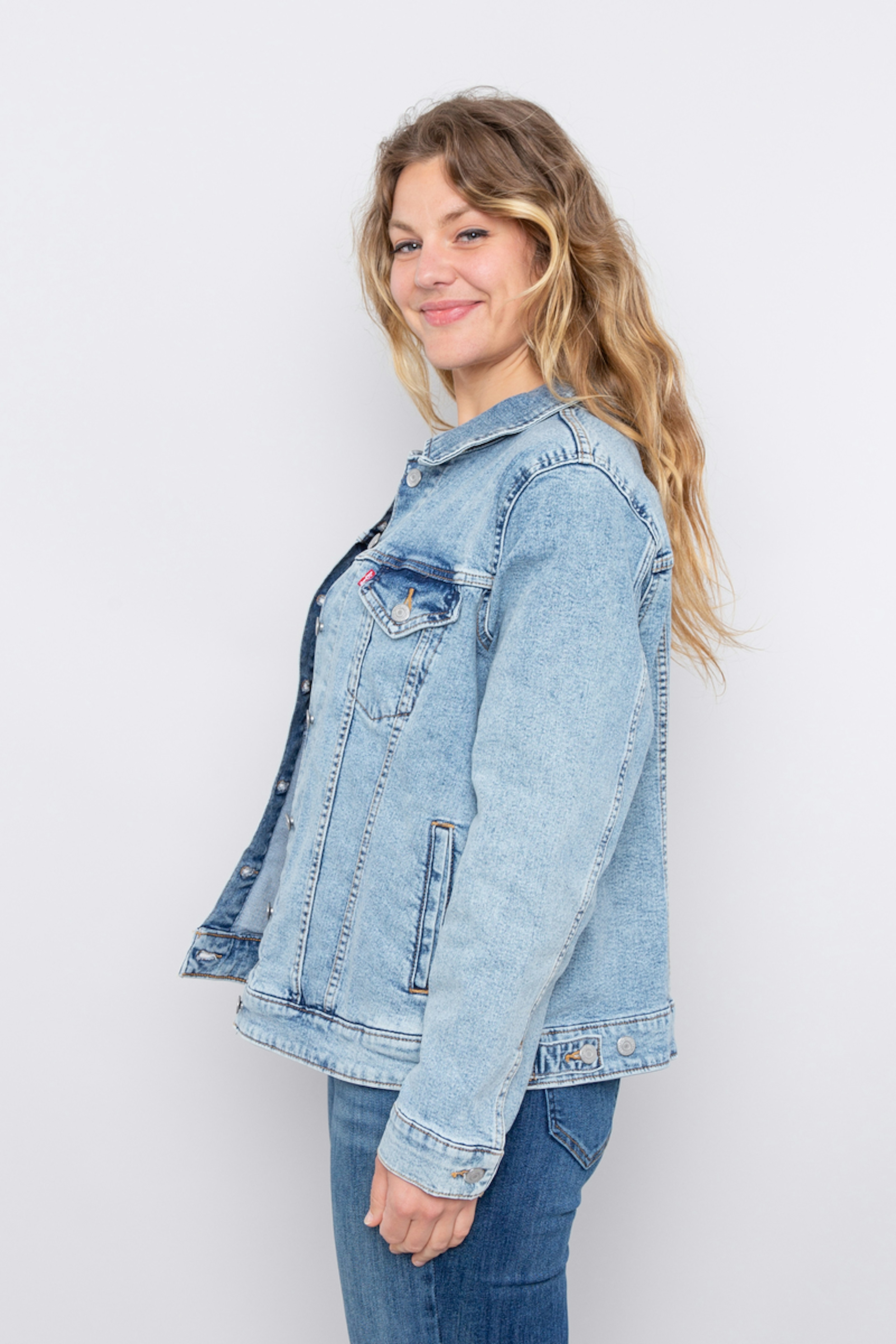 La veste Trucker, c'est la veste en jean classique qui a rรฉsistรฉ ร lโรฉpreuve du temps. โข Veste en jean ร manches longues au dรฉlavage vintage โข Col ร pointes, Patte de boutonnage avant โข Poches plaquรฉes sur la poitrine avec rabats boutonnรฉs, Poches passepoilรฉes cรดtรฉ โข Pattes dโajustement dans le dos