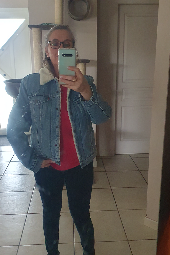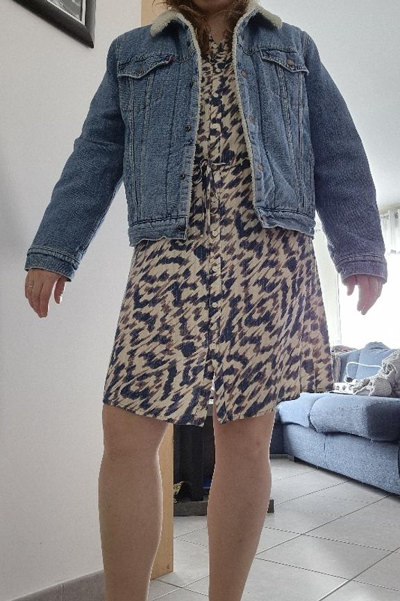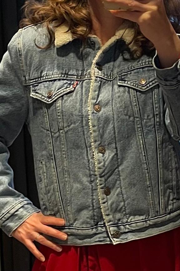 โข Veste en jean โข Doublure en sherpa โข Poche ร rabat sur la devanture de la veste โข Fermeture boutonnรฉe