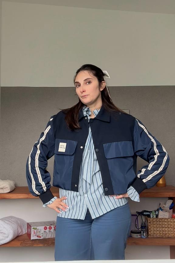 Associez cette veste versatile à un jean taille haute et des bottines pour un look moderne et audacieux. Parfait pour l'hiver! • Veste courte • Coupe tempérée • Manches longues • Poches à rabat • Bandes contrastées