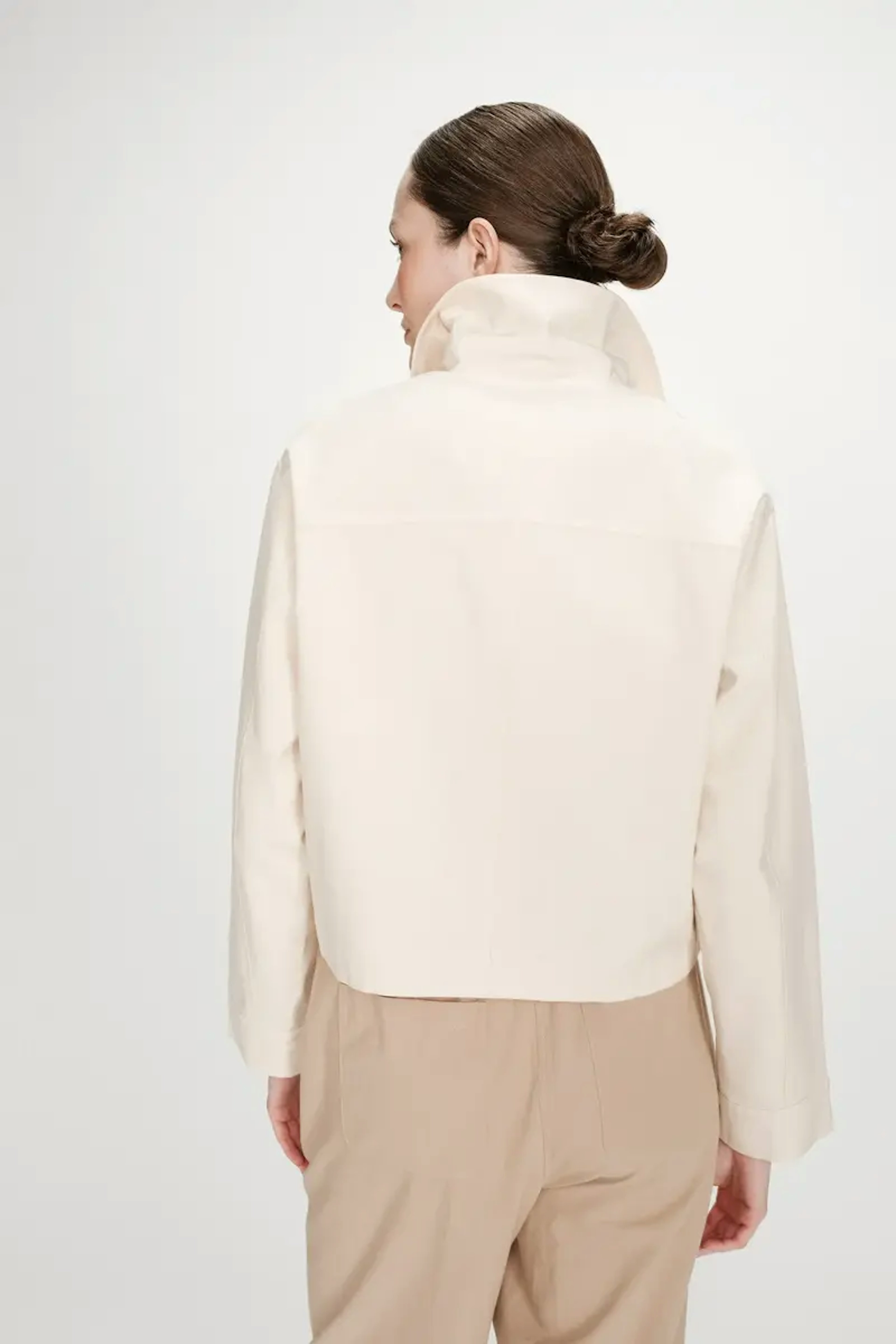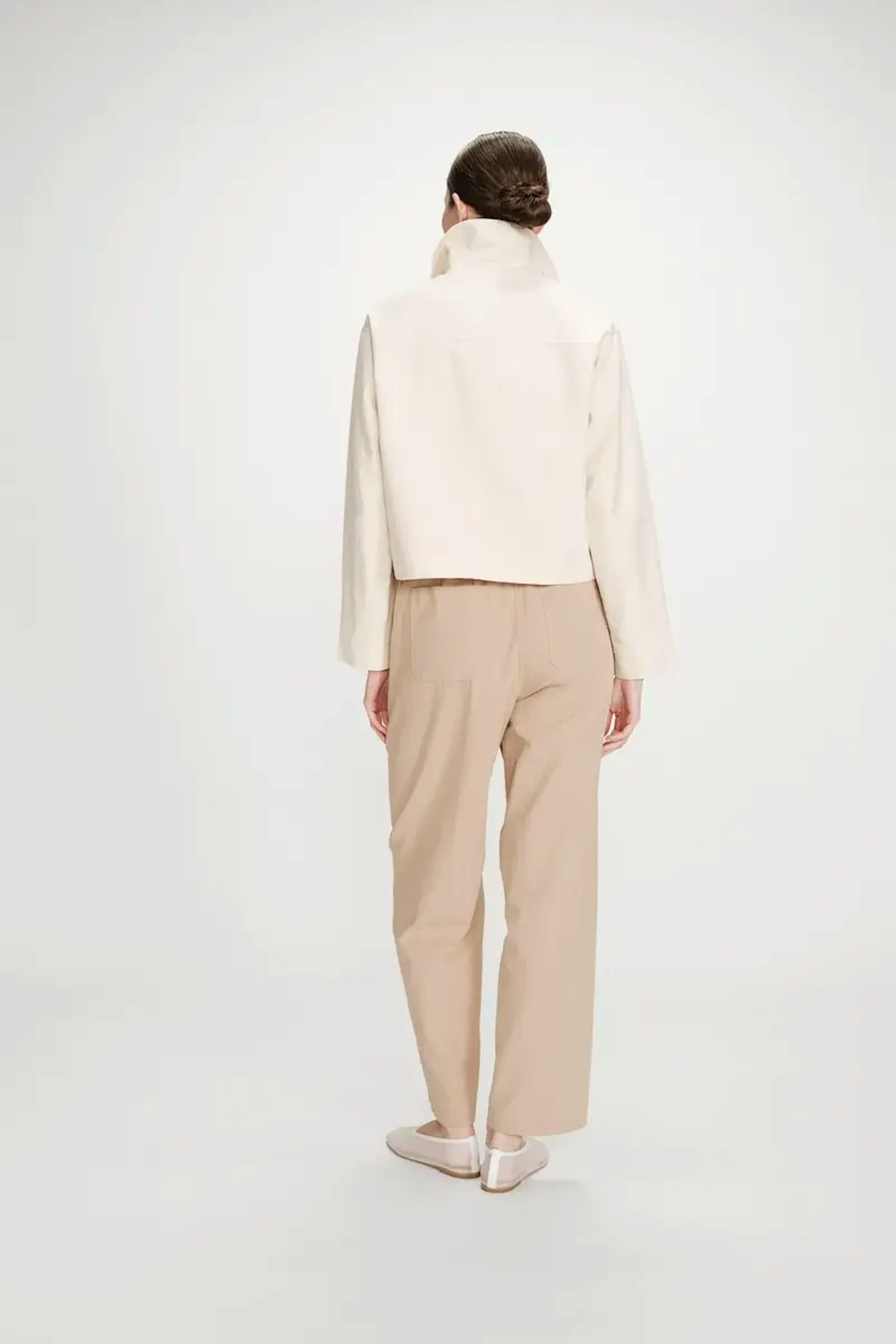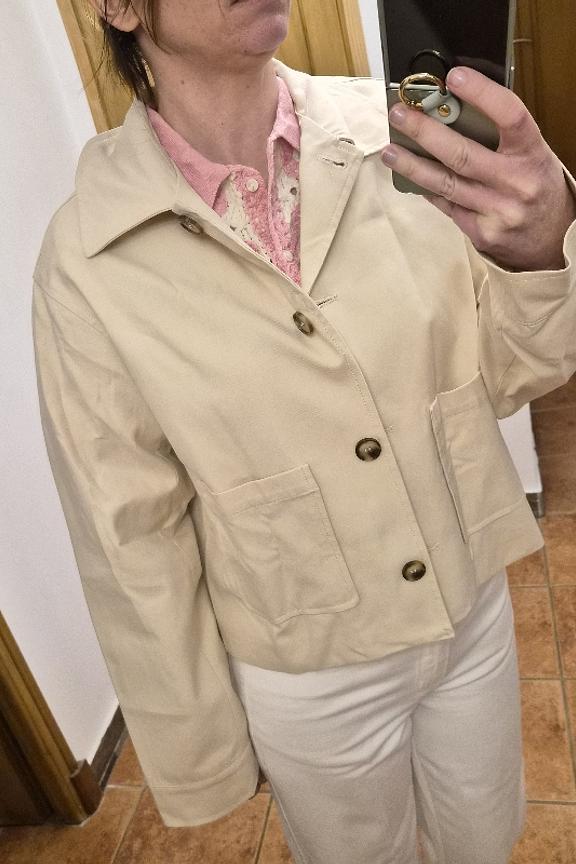 Associez cette veste à un pantalon ajusté et des bijoux dorés pour une élégance moderne d'été. • Veste en coton et Tencel • Coupe droite • Manches longues • Col chemise • Boutons contrastants