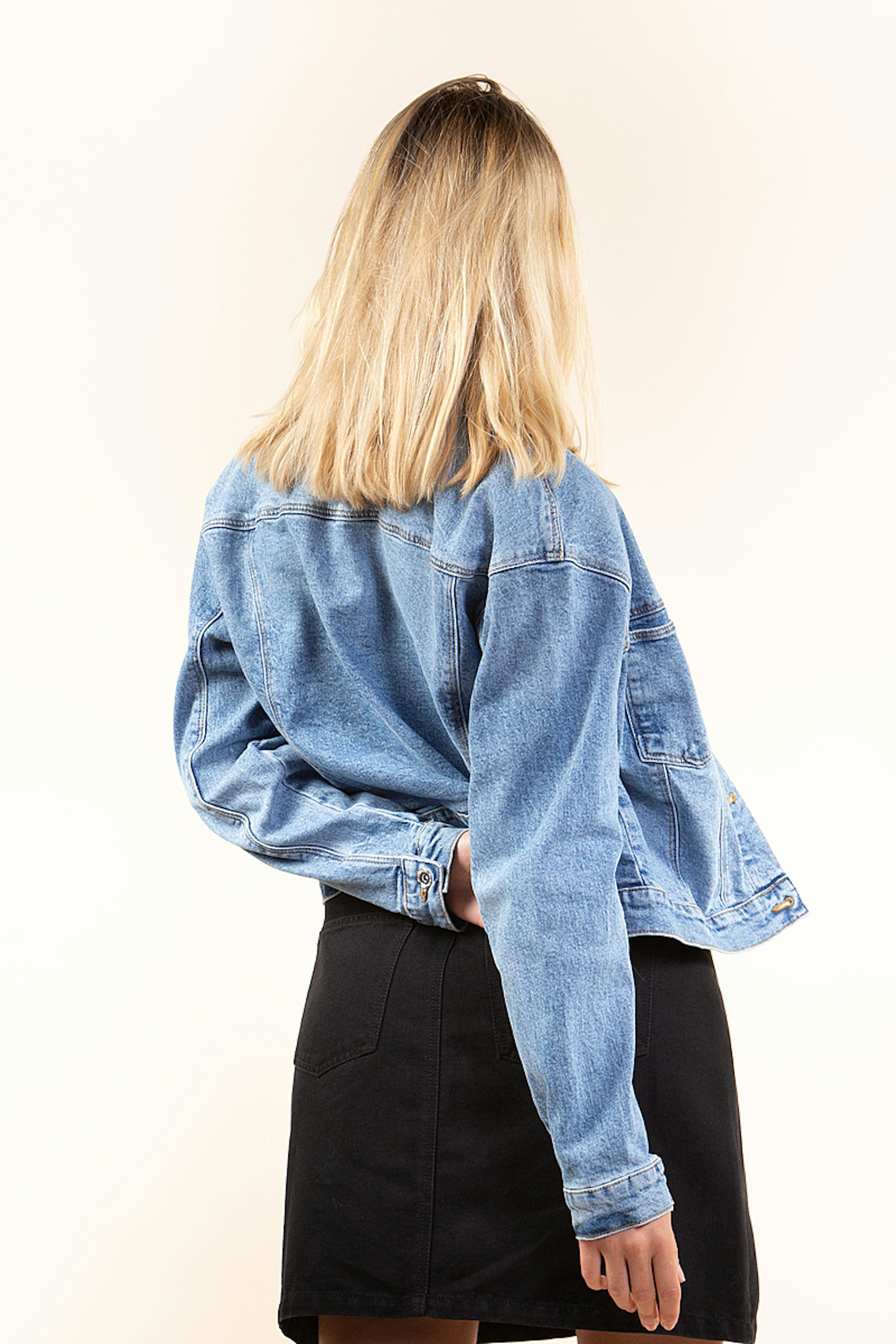 โข Veste en jean bleu clair โข Manches longues โข Coupe droite โข Se ferme ร l'aide de boutons โข Contient du coton bio