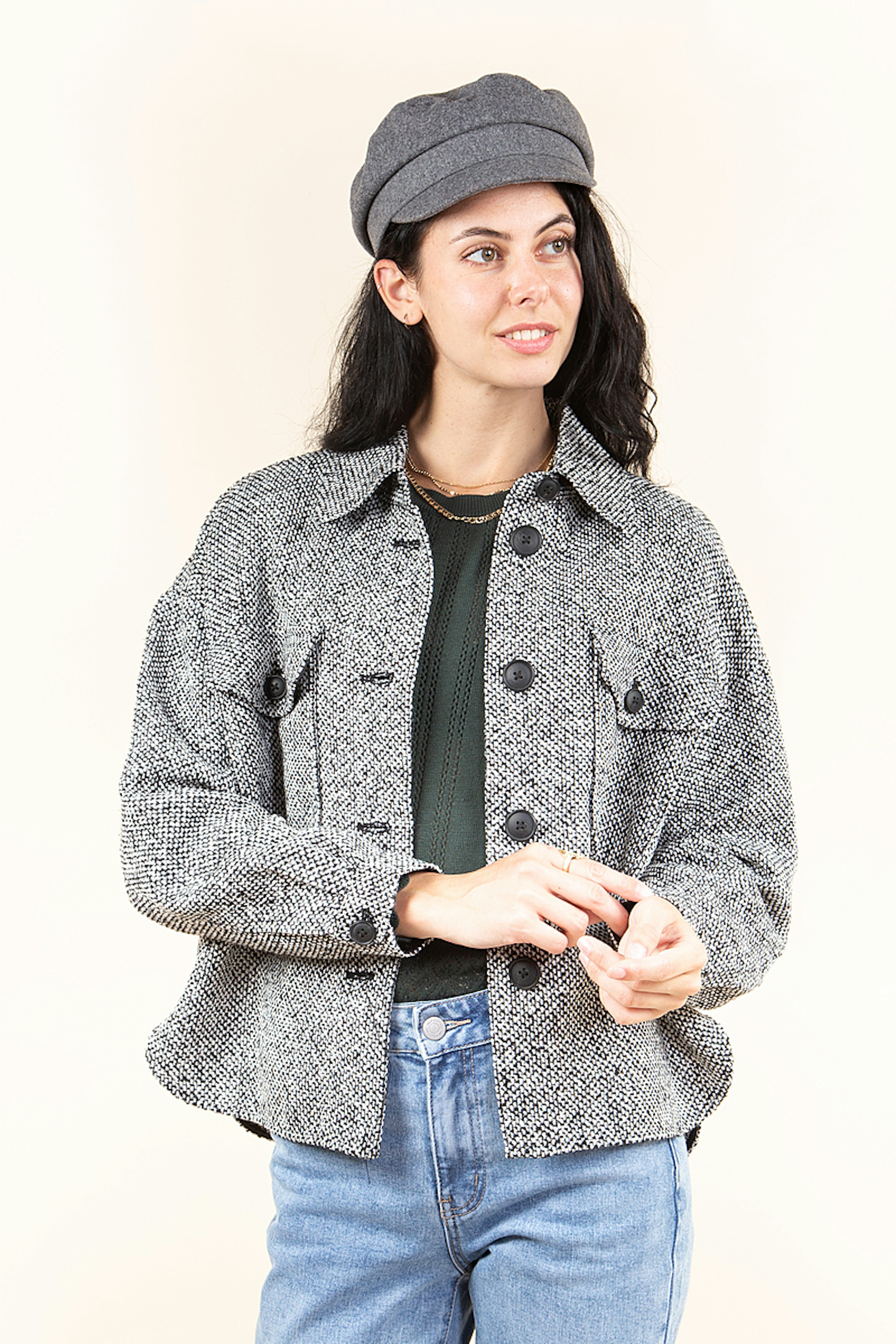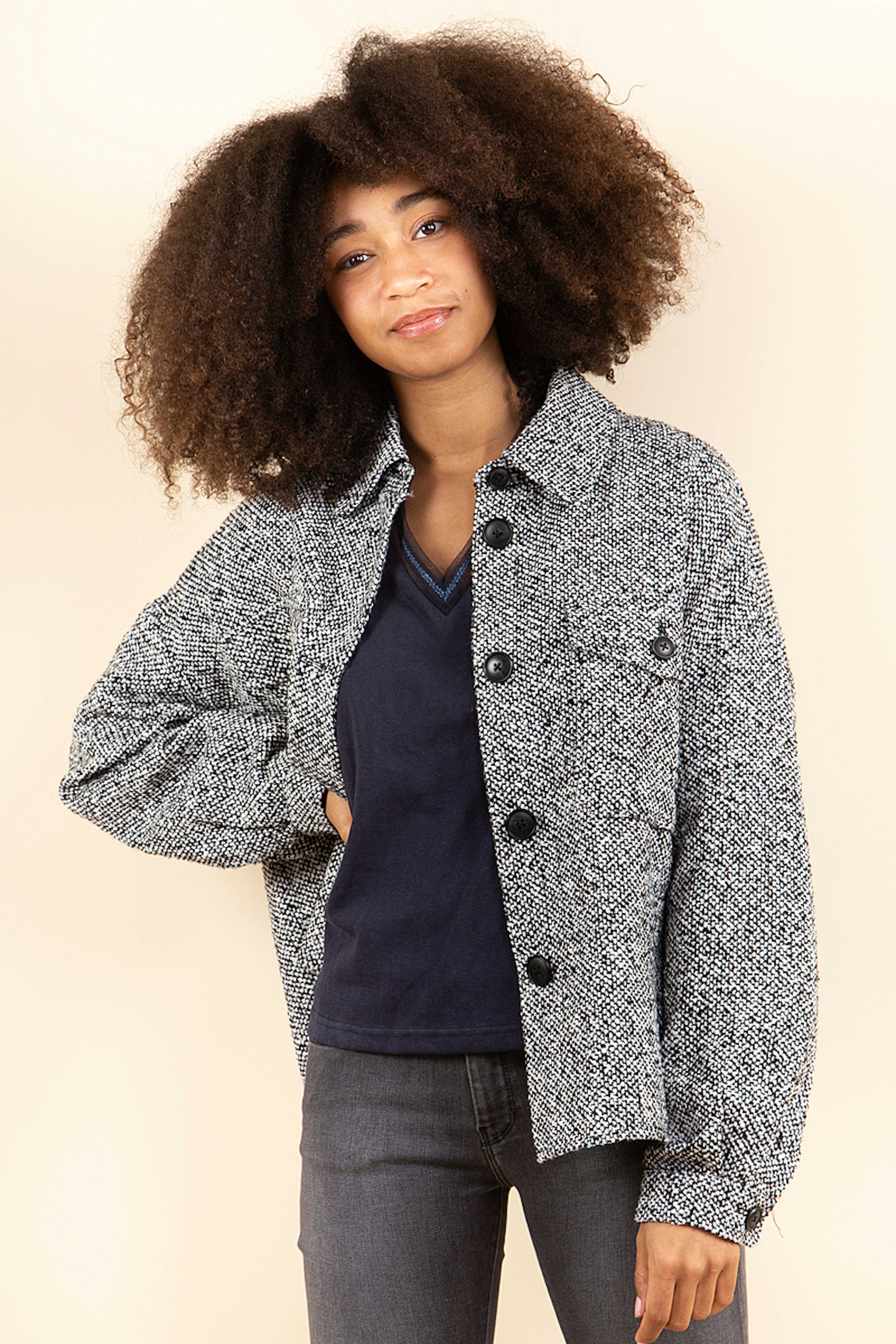 Cette veste ou sur-chemise รฉpaisse est ultra tendance. Son gris et sa matiรจre mouchetรฉe sont parfaits pour looker vos tenues quand il fait un peu frais. Fondรฉe en 1987, VERO MODA est une marque danoise qui propose des looks accessibles, mode et indispensables ร toute garde-robe. On a sรฉlectionnรฉ chez eux vos intemporels modernes et fรฉminins.